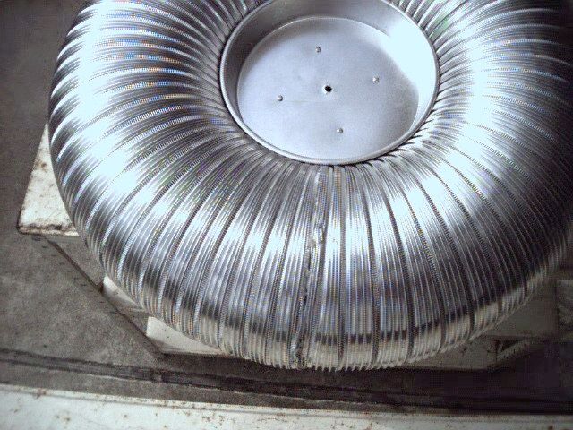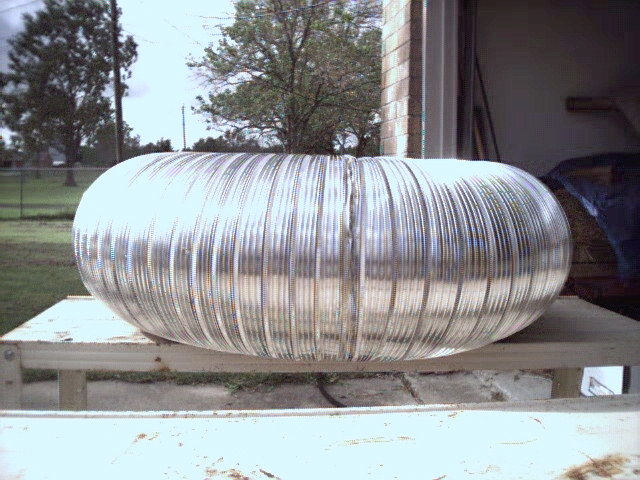 These are some shots of my latest toroid, a 7" x 26.5" one, made with semi-rigid ducting. The center hub is made from two cake pans from Big Lots(a dollar store type place). I screwed them together with four #6 machine screws. The seam isn't too ugly and I'll probably cover it with a piece of aluminium tape at some point for asthetics. This toroid is for my new 4" coil.