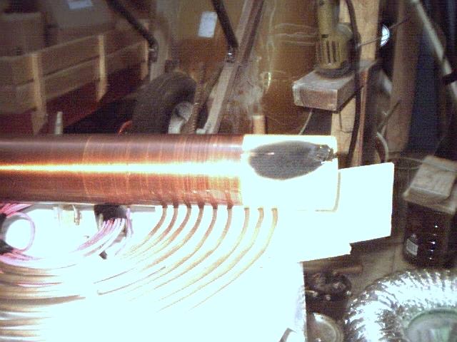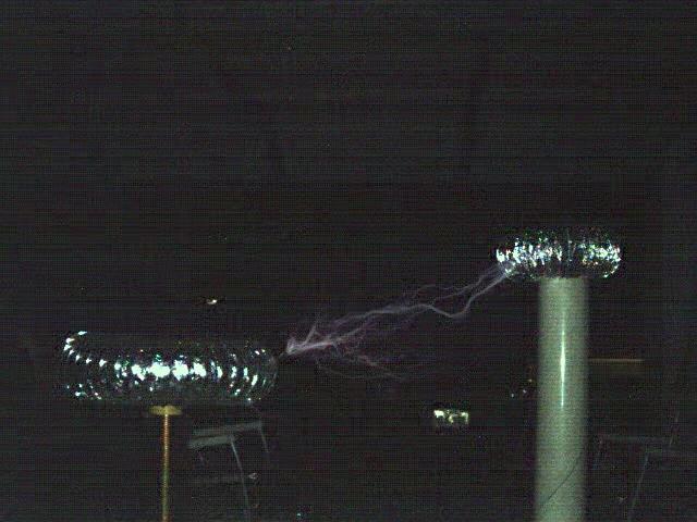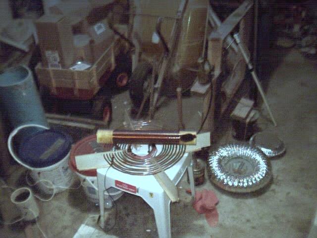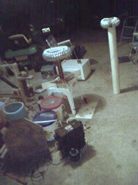 This is a shot of the setup at the time. I was running two 15/60 NSTs. The toroid on top of the vertical 4" PVC at the right was being used as a target.