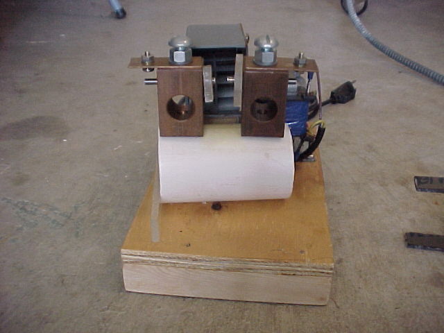 These are some shots of my single gap spark gap. I have 2 Tellurium copper blocks each holding a 3/16" 2% Lanthanated Tungsten electrode. Spacing is presently .3125". The quenching is provided by a squirrel cage fan from a microwave oven.