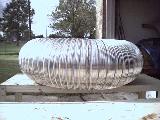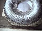 These are some shots of my latest toroid, a 7" x 26.5" one, made with semi-rigid ducting. The center hub is made from two cake pans from Big Lots(a dollar store type place). I screwed them together with four #6 machine screws. The seam isn't too ugly and I'll probably cover it with a piece of aluminium tape at some point for asthetics. This toroid is for my new 4" coil.